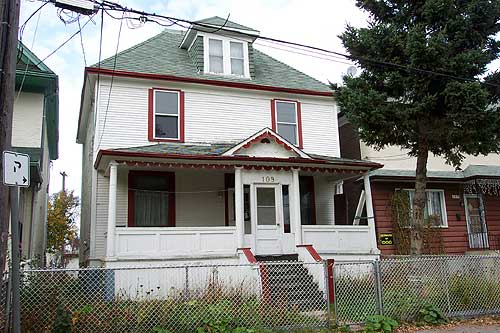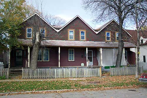 This large 2,300-square-foot house with twelve rooms, probably built as a rooming house, has unique arches on porch and flat top gables.