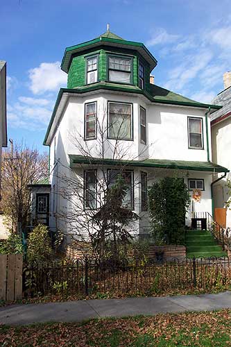 Large 2½-storey house with turret and attached one-storey brick retail store, the last surviving corner store in Point Douglas.