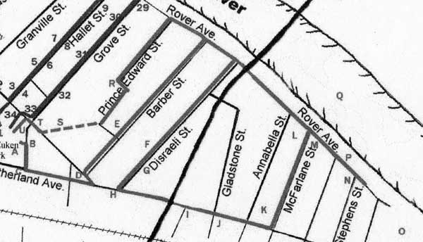 STOP R At the southwest end of Prince Edward Street is a row of five identical houses, 508 square feet each, built in 1905. |