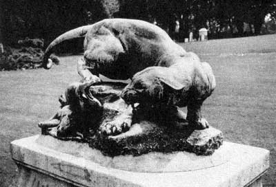 The intriguing piece of sculpture seen above, stands in the Parc Montsouris at the southern edge of Paris. It is in an open area of beautiful green lawn, and if the passerby knows how unsympathetic French park supervisors are towards people who venture onto lawns, he or she will probably give it a curious glance and move on. If, however, there is no guard in sight, the stroller who believes that a work of art has to be seen clearly to be fully appreciated might take the risk of walking across to get a closer look. The subject is dramatic: a panther and a python are facing each other, both poised to strike. On the left is a baby panther which has been killed by the python and is still in the grip of the reptile’s coils. The view from various angles reveals how superbly the artist has rendered the powerful body of the panther, the open jaws of the python, and the extreme tension of the moment. At the rear of the sculpture the artist’s name is clearly visible: Georges Gardet.