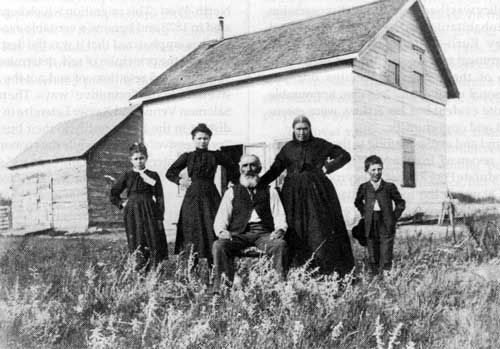 Jean Caron Sr., seated, wife Marguerite (nee Dumas), with son Albert and granddaughters Emma and Marie on their farm at Batoche, circa 1895. The Carons left St-Norbert, Manitoba for the West in 1872, first settling at St-Laurent de Grandin and then at Batoche, Sask. in 1881. Although Caron first made entry for river lot 52 in 1884, he only obtained patent in 1903, almost 20 years later. The family remained on the land until the 1970s when the property was incorporated into Batoche National Historic Site.