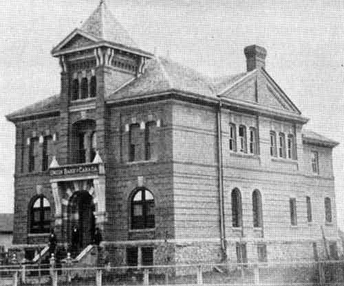 The Union Bank erected small branches on a more modest scale than the Yorkton and suburban Winnipeg branches. The buildings in Minnedosa, Manitoba and Wainwright, Alberta typify this most basic of banking halls. Essentially these buildings constituted square brick boxes. The Minnedosa and Wainwright structures possessed two storeys with the usual main entrance to the left flanked by a large window. The main and side elevations were illuminated by unadorned vertical windows instead of the stone-trimmed Romanesque windows with voussoirs common to the larger branches. The brick construction, the absence of columns, the window configuration and the presence of large cornices marked these structures as Union Banks. [23]