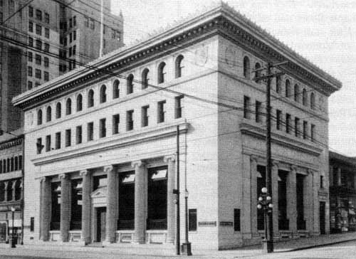 The Union Bank erected substantial offices in Edmonton and Vancouver. From plans by Edmonton architect Roland Lines and Vancouver architects Somerville and Putnam, branches in these two cities opened in 1910 and 1921 respectively. Both buildings utilized contemporary technology. Structural steel was used on the Edmonton building and reinforced concrete on the Vancouver branch. The interiors of the main floor banking halls bore a striking similarity to the hall at the Winnipeg headquarters. But the exteriors of the two buildings were neo-classical. The Edmonton branch more closely resembled the colonnaded neo-classicism of the Canadian Bank of Commerce at Main and Lombard Streets in Winnipeg than it did other Union Banks while the Vancouver office displayed an eclecticism of its own. The Edmonton building did share a few exterior features with corporate headquarters—main floor Romanesque windows and a huge over-hanging cornice. On the Vancouver branch, only the overhanging cornice, a common element in bank design, reflected the corporate style. [20] [See Figure 3.]