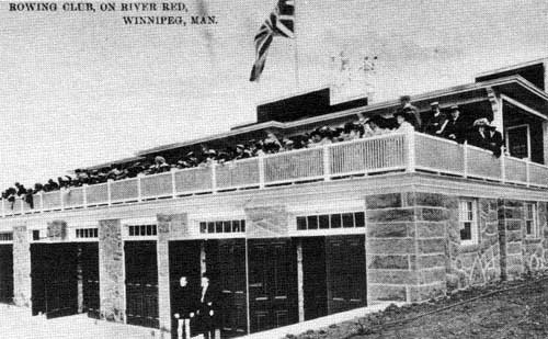 I have no knowledge of the first [Winnipeg Rowing] Club House which was a floating one, moored, I believe, to the Main Street Bridge where it crossed the Assiniboine River. This Club House was demolished by the ice in the Spring of [18]84. A site was then secured on the south bank at the junction of the Red and Assiniboine Rivers, the property of Donald A. Smith, later Lord Strathcona. A very pretentious Club House for the time was erected on this site and was in use at the first Regatta of the Minnesota and Winnipeg Rowing Association in 1886. It was financed by subscriptions and the sale of term debentures. I do not think that any of these debentures were redeemed in cash but they were accepted in payment of membership dues, and many were redeemed in this way. The boat storage was on the ground floor and on the upper floor, a shower room and locker room was located in the rear, and a recreation room and verandah in the front. The water supply was from a windmill which pumped into a tank, and the drainage, of course, was to the river. This Club House served its purpose very well, and was approached from Main Street over an open common. The advent of the Northern Pacific Railway into Manitoba about 1889 partially cut the Club House off by the railway embankment and bridge coming into the old Northern Pacific station on Water Street. Later the Norwood Bridge was built, which interfered to some extent with the course; and about 1907, when the Canadian Northern developed the present Union Station property, they approached the Club with a view of our giving up this site. After a good deal of consideration we first secured an option on two lots in Norwood, next to the old Norwood Bridge, but later were able to arrange through the late Fred W. Heubach for the site now [i.e. 1934] occupied, which was donated, subject to certain building restrictions.