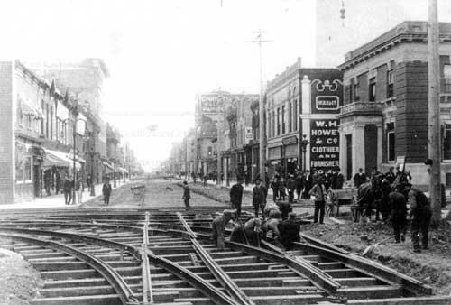 Laying tracks for streetcars, Brandon, circa 1902.