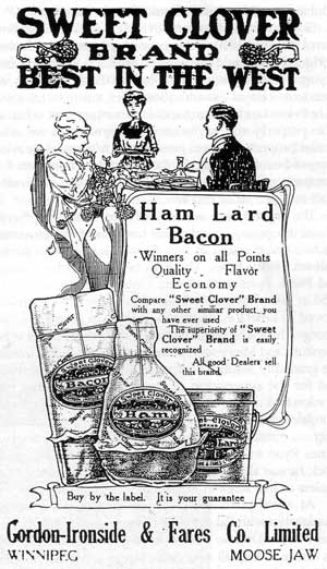 Advertisement for Sweet Clover Brand Ham, Lard and Bacon, Gordon, Ironside and Fares Co. Ltd., Henderson’s Winnipeg Directory, 1918, page 77.