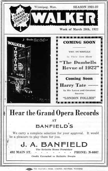 Much of the credit for the fine entertainment was due to the efforts of Walker’s wife, Harriet, who encouraged amateur productions, notably university drama groups and the Winnipeg Kiddies, a popular children’s vaudeville show that toured North America for several years. She also aided her husband in booking music and drama productions for the Red River Valley Circuit. She wrote intelligent and well-informed press material on theatre topics for all Winnipeg newspapers; she was also a member of the Canadian Women’s Press Club. The Walkers’ daughter, Ruth Harvey, later published a detailed and entertaining collection of reminiscences about life with her parents (“papa” and “mamma”) at the Walker Theatre. [11]