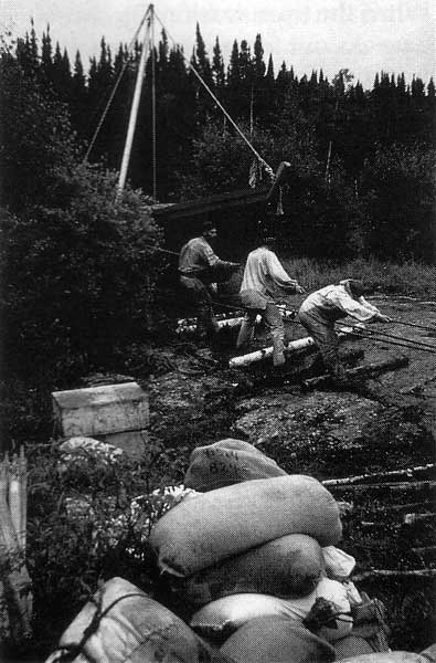 It took us two entire days to span that meagre distance, in the most foul weather imaginable. It was not fun at all! In fact, it was tremendously difficult and unpredictable, with the entire team pulling on a rope connected to a squeaky old block-and-tackle, heaving with all our might to drag BOB one inch at a time across a path of rollers cut from poplars. We had to constantly stay alert of potential hazards, and be ready to dodge them when necessary. Keeping a safe distance was also critical, so as to not get crushed by either the boat or rollers. To top it off, we had to do all this while trying to remain upright in our hobnail boots—which, on the rocks, felt more like ice-skates. It was tricky to say the least!