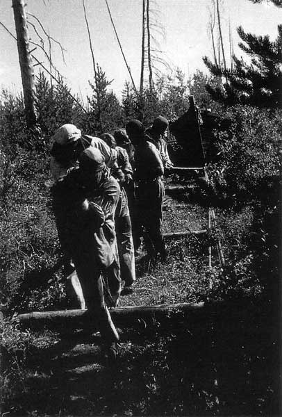 Crossing the Painted Rock portage between the Echimanish and Hayes rivers, late July 2001.