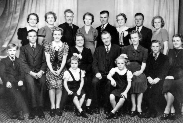A special day in our lives was the day we had our family picture taken in the early 1940s. At that time, some of our family members were married; some were working away from home; the war was on so Mother and Dad decided that this would be a good time to get all the family together for a family photo. It was decided that four cars would be needed to transport our family to Winnipeg. Mother made jumpers and blouses for the little girls, Beatrice and Margaret and it was decided that our youngest brother, Einar, would need a suit, shirt and tie, which would be bought in Winnipeg before the family photo could be taken. The older children were responsible for wearing their best outfits, with shoes all shined up and polished. Dad made reservations for our photo to be taken at The Bay Photography Shop.