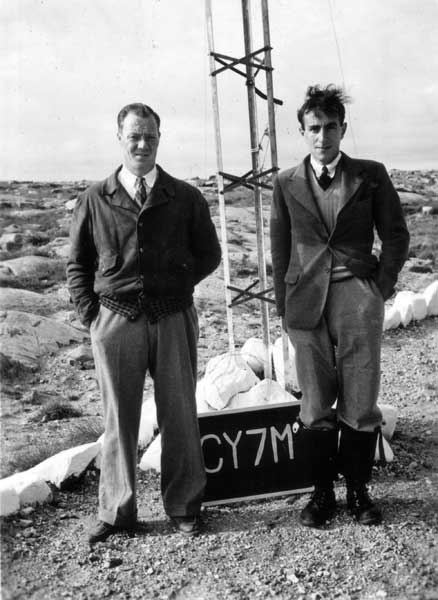 Edward Beauclerk Maurice (right) passes the reins of HBC post management to P. Dalrymple at Southampton Island, 1940.