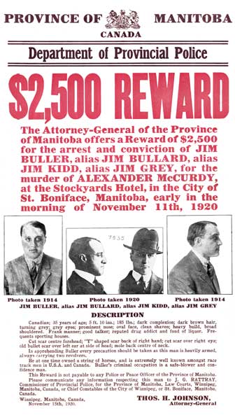 Reward poster for Jim Buller, wanted in connection with the murder of two MPP constables in St. Boniface, November 1920.