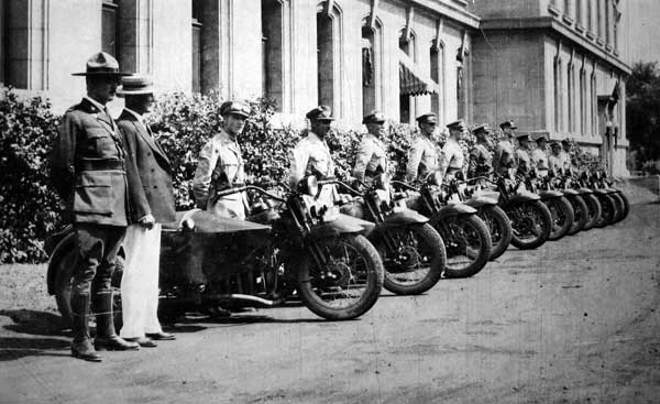 The ninth and final Chief was Colonel H. J. Martin who also used his military rank. He remained at the head of the MPP until it was absorbed by the RCMP and he carried on his career in that force. In all, seventy-four members transferred to the RCMP. They remained in the province and, in most cases, the same detachment. The Manitoba government agreed to pay $100,000 per year in return for the federal government maintaining a force of 125 RCMP officers in the province. This kept up until 1937 when the contract went up to $150,000 and the strength went up to 150 members. Along with the takeover of most MPP personnel, the federal government agreed to purchase all the stores and equipment of the MPP for the sum of $20,000. The long list of items included everything in the detachments as well as its offices in the Law Courts Building. Many detachments listed homemade desks and chairs indicating that budget restraints are not new to police departments. There were also three Thompson submachine guns, ten rifles, seventy-six revolvers, and a quantity of handcuffs, billies and Sam Browne belts. The twenty-six patrol cars in use were mostly Fords but there were also three Whippets, an Essex, a Nash, a Hupmobile, a Dodge, and a Chevrolet. The thirteen motorcycles in use were Hendersons. The northern detachments turned over three railway track cars as well as four canoes.