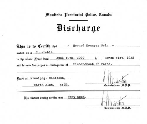 Constable Howard Weir’s MPP discharge papers in 1932, when he transferred to the RCMP.