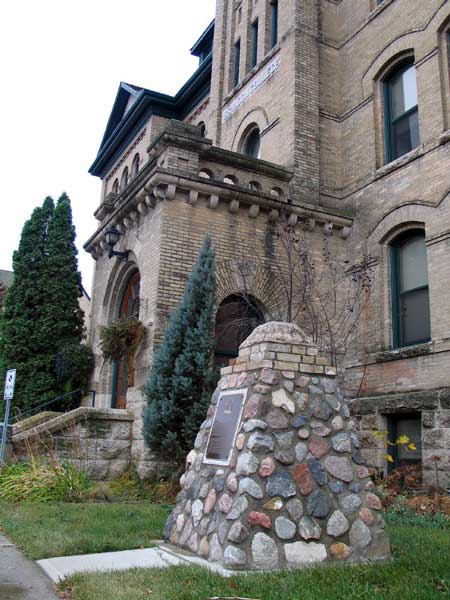 A commemorative cairn on the grounds of Brandon University was built, in part, with stones from the original Prairie College building at Rapid City.