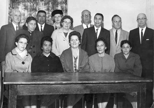 The Friendship Centre’s first official board, which replaced its original volunteer board, came into office in 1966. Its members included (front row seated, L-R): Audrey Silvius, Cordelia Wasteste, Grace Godmaire, Pat McKay, Rose Esquash; (second row): Margaret Kinyewakan, Norma Walmsley, vice-chairman Arthur Wambidee, E. C. Gorrie, chairman H. F. Morse; (third row): R. B. Hunter, Morris Kinyewakan, Helen Reisberry, and Chris Verhoef. Missing from the photograph were M. C. Holden, Alvin Hamilton, David Hammond, John W. Pool, Dr. John E. Robbins, and Don Simpson.