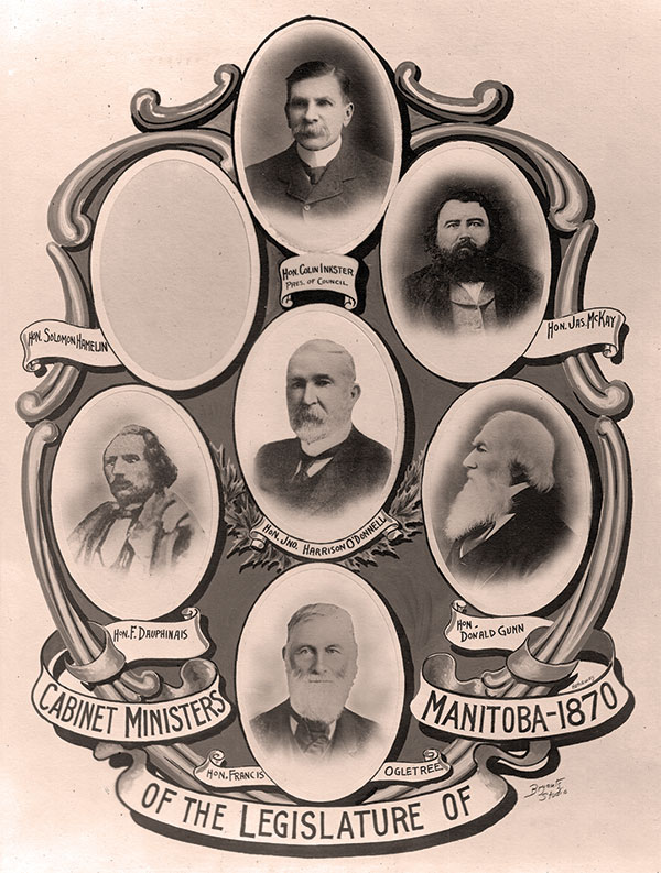 Archibald’s selection of the Legislative Councillors attempted to give representation to all the major cultural elements in Manitoba. He selected members who would provide a representation of the major cultural groups in the province—French and English; Roman Catholic and Protestant; Métis and descendants of the Selkirk Settlers. The first Councillors were James McKay, a Scottish Métis of Catholic descent; François Dauphinais, a French Catholic Métis who had been a member of the Council of Assiniboia and later the Vice-President of the Provisional Government; Salomon Hamelin, another Métis and Hudson’s Bay man who had maintained some degree of neutrality during the troubles; three English Protestants and descendants of the “old settlers” of Lord Selkirk—Colin Inkster, Francis Ogletree and Donald Gunn. Finally, the seventh councillor, Dr. John H. O’Donnell, was a recently arrived Irish Catholic Anglophone from Montreal. [37] By composing the Legislative Council thusly, Archibald conformed to the spirit of the Manitoba Act’s tenth clause which established the Legislative Council as a check on hasty legislation and a protector of minority rights. His selections as Legislative Councillors resulted in a balance of representation between the predominant cultural groupings of the province.