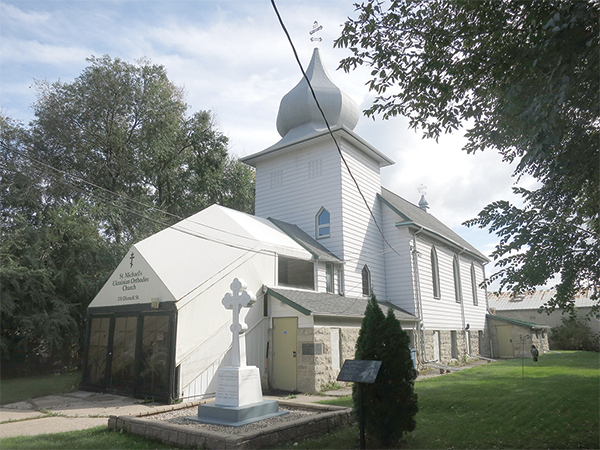 St. Michael’s Ukrainian Orthodox Church (110 Disraeli Street, Winnipeg) was erected in 1902 as an Anglican Mission Church, located several blocks away on Rachel Street (now Annabella Street) near Sutherland Avenue. It was moved here in 1906 when the City expropriated its original site to widen Sutherland Avenue. The Mission closed around the time of the First World War and, in 1918, the building was purchased by the congregation of the National Greek Orthodox Church of St. Michael.