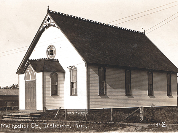 Treherne Methodist Church, seen in this postcard view around 1908, was sold after union and used as a dance hall and movie theatre.