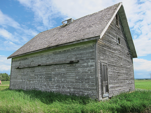 The former Umatilla United Church in Grandview Municipality, built in 1912, once hosted Methodist and Presbyterian services. After it closed, the building was used as a granary but now stands empty.