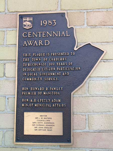 Carberry centennial plaque on Old Town Hall, Carberry (April 2010) |