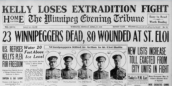 The men settled into the dreary routine of trench warfare on the Western Front. As one Winnipeg soldier wrote, “‘Up the line’ meant spending days in cramped trenches watching comrades killed and wounded by bullets, bombs or shells, the nights are hours of ceaseless work and watching. ‘Out on rest’—a succession of work, carrying, training. And always all over rats, vermin, gas and the knowledge that each moment of life is enslaved to other men in some remote headquarters.”