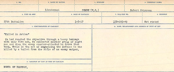 Robert Grierson Combe V.C., Circumstances of Death Card