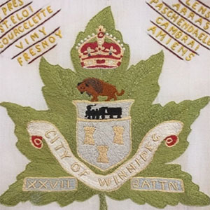 The 27th Battalion mobilized in October 1914, and, in December, the men were billeted at the Old Agricultural College Dairy and Machray Buildings at Tuxedo Park. They trained over the winter and one memoirist recalled their primitive drill, “Trenches of snow were built with protection of binder twine to act as barbed wire. These were used for instructional purposes and later for attack purposes.” A month before the Battalion departed for England, the men received their made in Winnipeg, 27th “City of Winnipeg” Battalion, hat badges in a ceremony in front of City Hall. “The design was simple and effective, wrote a local paper, “being the city coat of arms mounted on a maple leaf and containing the inscription XXVII BATTN.”