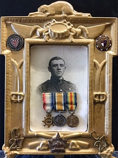 Framed picture of Private J. Denny taken in London circa 1915 with Canadian service cap badge, collar tabs and war service badges added post war