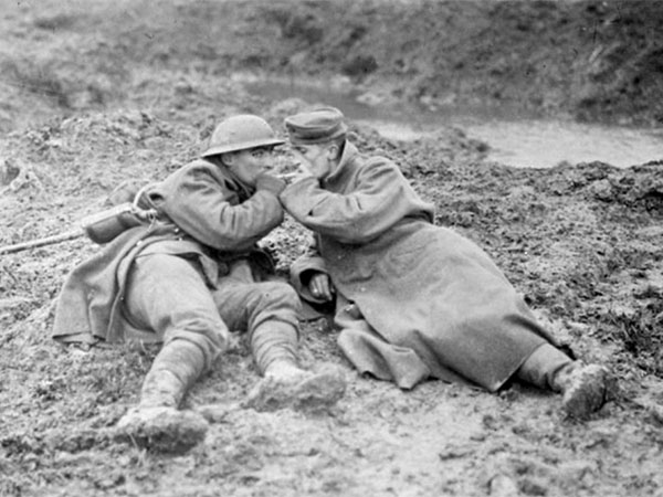 On 6 November 1917, 22-year-old Fred Watts from Mafeking was wounded in the thigh during the 27th Battalion’s attack during the Battle of Passchendaele. Here he shares a cigarette with an unidentified wounded German soldier.