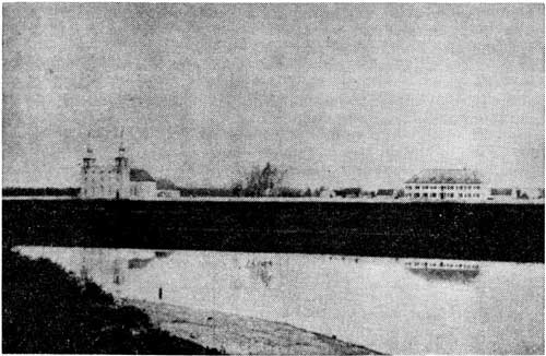 In nearly all the early photographs of St. Boniface, across the river from Winnipeg, stood the "turrets-twain" Cathedral made famous by the American poet John Greenleaf Whittier in his poem "The Red River Voyageur." In all of these photographs could be seen a long, gabled, white building which was the home of the Order of Grey Nuns. The Cathedral was lost in a fire in 1860 and the Cathedral which followed was succeeded by the present magnificent Basilica in 1908.