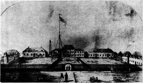 York Factory in 1853. The central building, in the form of an open square, is the only one that remains.