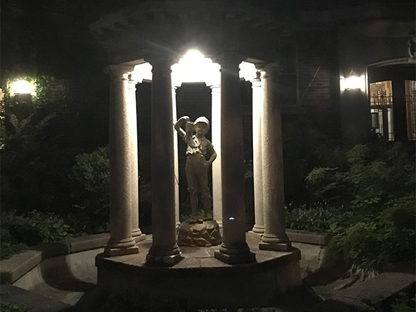The cast-iron boy in Hershey, Pennslyvania stands over a small lake in the Rose Garden of the Hershey Estate. He was purchased in 1906 from the J. L. Mott Iron Works, New York City, and is supposed to be of Italian origin. We have tried to contact this company, but according to the New York postal authorities, it no longer exists.