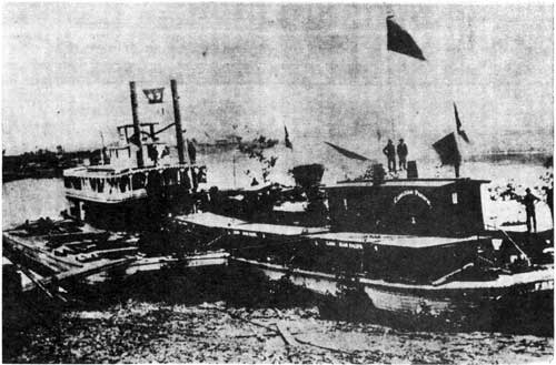 The Selkirk was handsomely decorated for the occasion with Union Jacks, Stars and Stripes, banners with the familiar 'C.P.R.' and her own bunting; with the barge conveying the locomotive and cars ahead of her, also daily decorated with flags and evergreens, and with a barge laden with railway ties on each side presented a novel spectacle, The continuous noise and din proclaimed loudly that the iron horse had arrived at last."