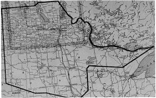 The boundaries of Assiniboia (The Lord Selkirk Grant) are here imposed on a road map to show the political divisions and landmarks which are now situated therein.