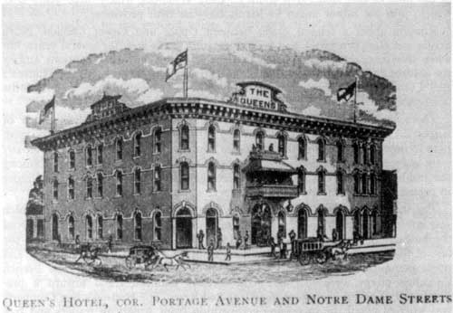 Incidentally, in the above picture, the hotel is designated simply “The Queen’s.” Is this an early Winnipeg huckster’s ploy to belittle the opposition houses? When The Queen’s was being built it was billed as: “The finest hotel in Manitoba, frontage 180 feet, built of white brick, three storeys high, with an iron roof, 50 bedrooms, three parlors, commodious offices, barber shop, bathrooms, billiard room, lecture hall, sample rooms for commercial men, all modern appliances, and the longest bar in the northwest, [it ran the entire length of the building, from the corner of Portage and Notre Dame to the corner of Portage and Main] and as the proprietors are old hotel men, there will be nothing wanting in its composition to make it a first-class house.”