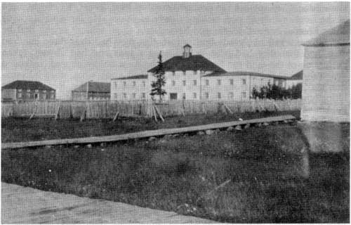General view of buildings at York Factory in 1910; the centre one, originally built in the form of an open square, still stands. Compare buildings and environs with Ford & West lithograph here, which was done in 1853.