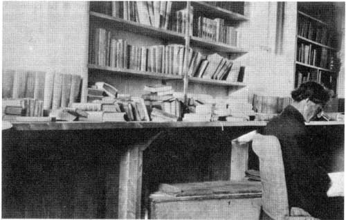 The Reverend R. Faries is seen in the famous library at York Factory. Many travellers wrote about the splendid books and “literary riches” it contained.
