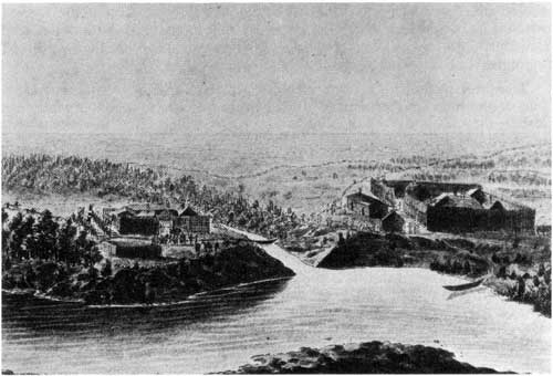 The above sketch by Peter Rindisbacher (1822) shows Fort Daer (left) and Pembina Post (right) at the confluence of the Red and Pembina Rivers.