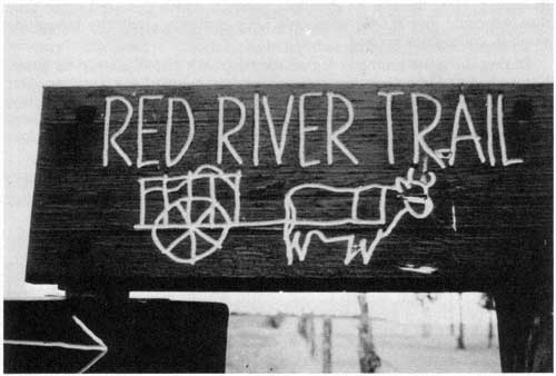 This marker near Wadena, Minnesota, and others like it, shows the places where old Red River Trails are intersected by modern roads and highways.