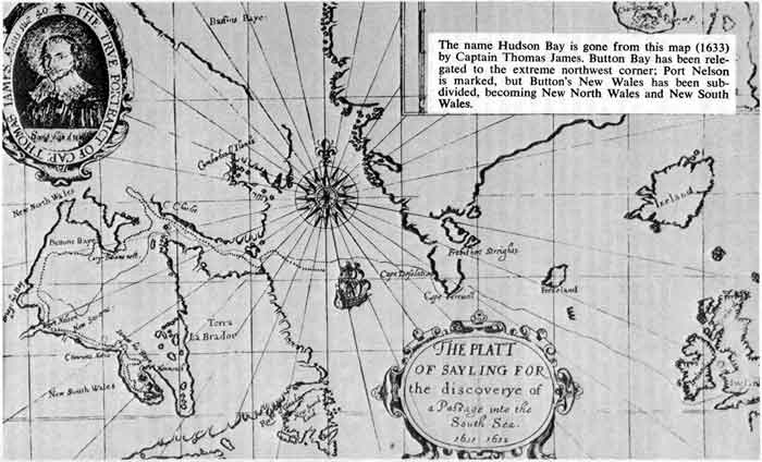 The name Hudson Bay is gone from this map (1633) by Captain Thomas Button. Button Bay has been relegated to the extreme northwest corner; Port Nelson is marked, but Button's New Wales has been subdivided, becoming New North Wales and New South Wales.