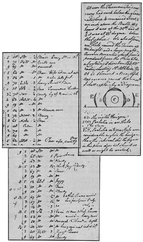 Peter Fidler's weather record, Cumberland House, 1790, contains notes on the growth in his garden as well as daily temperature readings. Right: Thomas Hutchins' meteorological journal, York Factory, 1772, has a sketch of a parhelic ring around the sun.