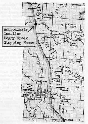 After four years at Crow Stand, Fort Pelly, the teaching assignment petered out and my grandfather and his three children moved to Boggy Creek (north of Roblin). Here they were joined by my grandmother and the rest of the family, there being ten children in all. They built their log home at the point where the Pelly Trail crossed Boggy Creek, a tributary of the Upper Assiniboine. My grandfather was known throughout the district as "Boggy" Johnston, and his home was called the "Boggy Creek Stopping House." Here travellers could secure overnight accommodation and meals long before the days of rural hotels and motels. At this time the C.P.R. had reached Moosomin and supplies were picked up from this point, the overland trip usually took two weeks, two trips being made each year.