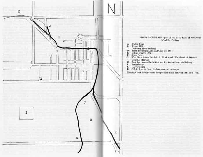 The accompanying map shows the approximate location of the spur which ran between the hills of Stony Mountain. More precise information may become available when the Manitoba Archives map collection is catalogued.