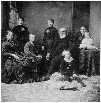 Family portrait circa 1889: Rear (standing I. to r.) Al Whitehead, Carrie (Edith) Mori]; Front (seated l. to r.) Third Mrs. Whitehead (sister of Senator McDonald), Hailes Ross, Joseph Whitehead, Joseph Ross (on rug), Dr. Charlotte Ross (behind table), Lottie Ross (baby later Mrs. Paget).