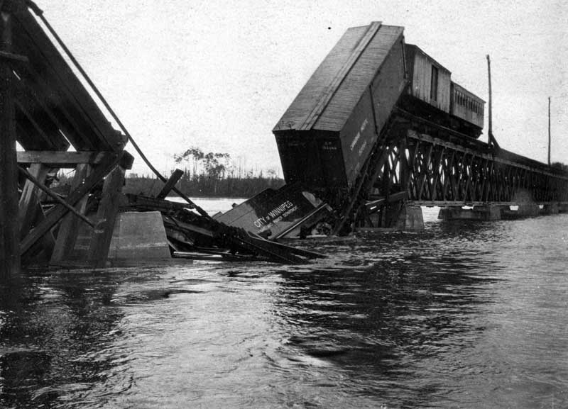 The first bridge in that locality, built of timber, was constructed in 1907 to service the hydro development at Pointe du Bois. Tons of construction material rolled over it for years. Tragedy struck on 30 June 1914, when a fifty foot span gave way just as the City Hydro train was approaching the west side of the river. The engine plunged into the water and the engineer, George Wrighton, was killed. The fireman escaped injury.
