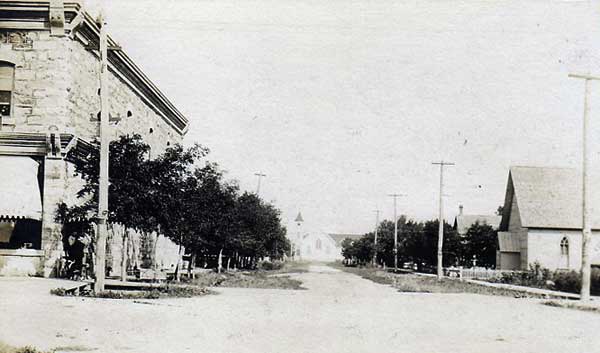 Postcard view of Eighth Street in Morden with the Land Titles Office at left and St. Thomas Anglican Church at right (date unknown)