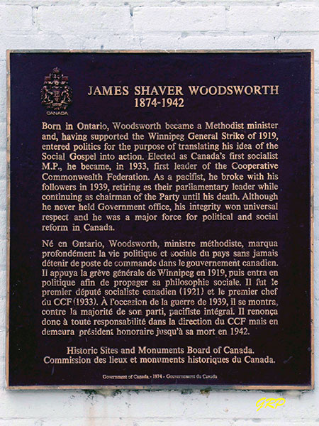 On the northwest corner of the building is a plaque erected in 1974 by the Historic Sites and Monuments Board of Canada. It honours James Shaver Woodsworth, Methodist minister, politician and champion of the poor and social reform.