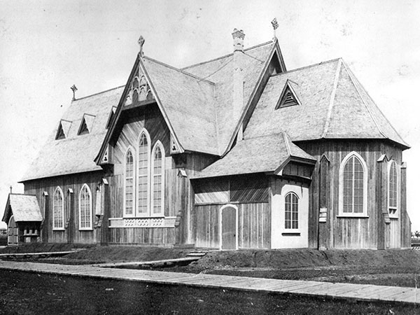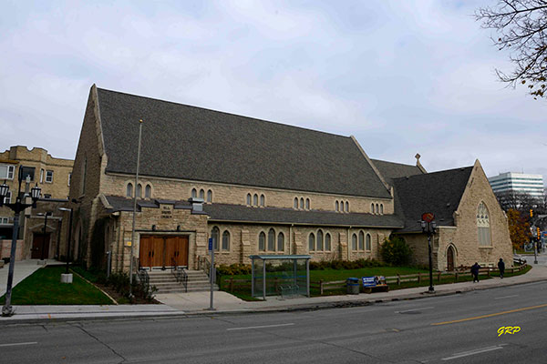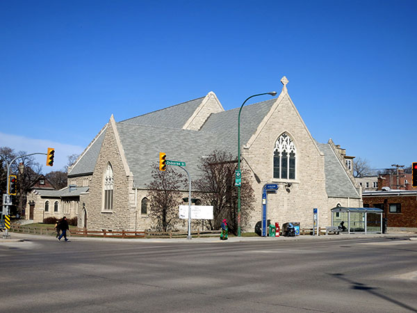 This Anglican church at the northwest corner of the intersection of Broadway and Osborne Street in Winnipeg replaced a predecessor church by the same name, which had been constructed slightly to the east in 1883. When city plans called for the northward extension of Osborne through the existing church, the building was demolished and construction of the replacement commenced in mid-1926, on a design by the architectural firm of Northwood and Chivers. A cornerstone was laid at a ceremony on 25 September 1926 and dedication of the new building occurred on 23 December 1926.