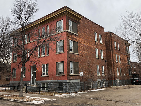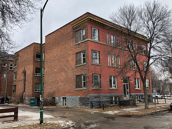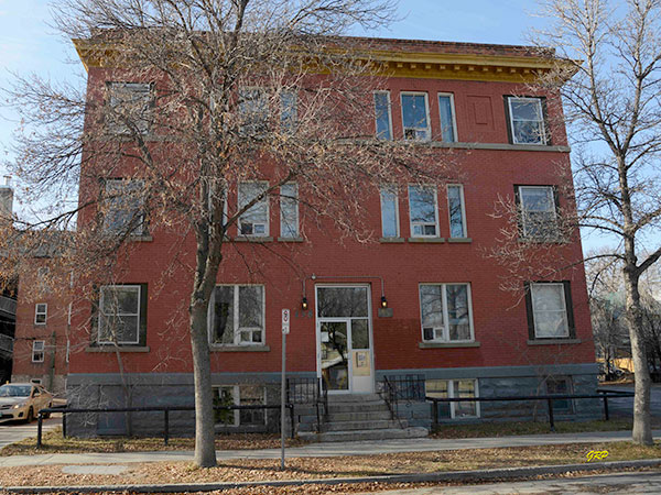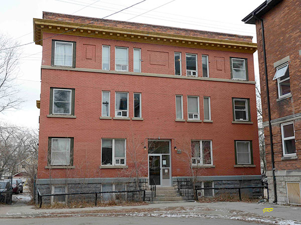 This three-storey brick apartment block on Young Street in Winnipeg was designed by local architect Peter Cornelius Samwell and constructed in 1911 by contractor John Edward Wilson at a cost of $45,000. The 89 by 48 foot building contained 15 apartments in its original configuration.